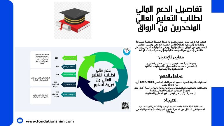 أعلنت خيرية الشركة الوطنية للصناعة والمناجم اسنيم اليوم الاربعاء 25 مارس 2026 عن دعمها السنوي لطلاب التعليم العالي للسنة الدراسية 2025-2026 ، وقد استفاد من الدعم 104 طالبا جامعيا من الطلاب في الخارج ، و 225 طالبا جامعيا داخل الوطن ، ليبلغ العدد الإجمالي للمستفيد في الداخل والخارج 354 طالبا
